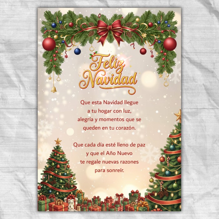 Esta tarjeta de Navidad nos transmite un espíritu cálido y festivo desde el primer vistazo. En la parte superior, podemos observar un hermoso adorno de ramas de pino, piñas, luces y lazos rojos que enmarca la imagen, destacando en el centro dos campanas plateadas decoradas con cintas rojas.
