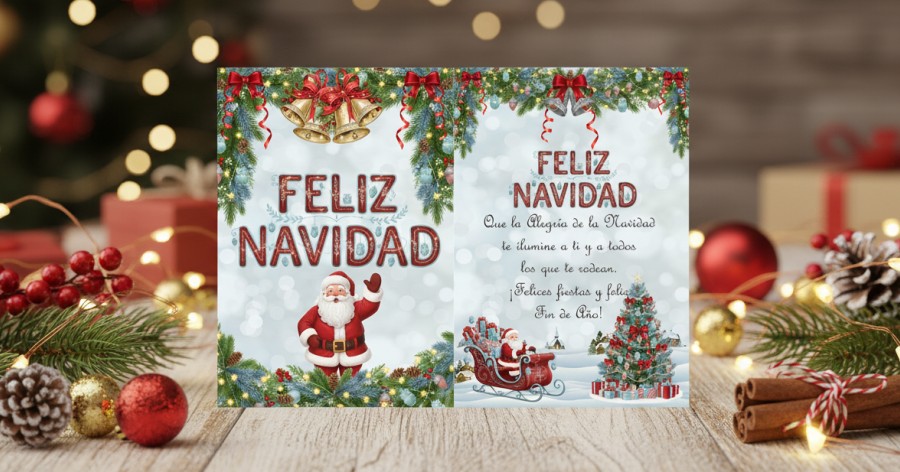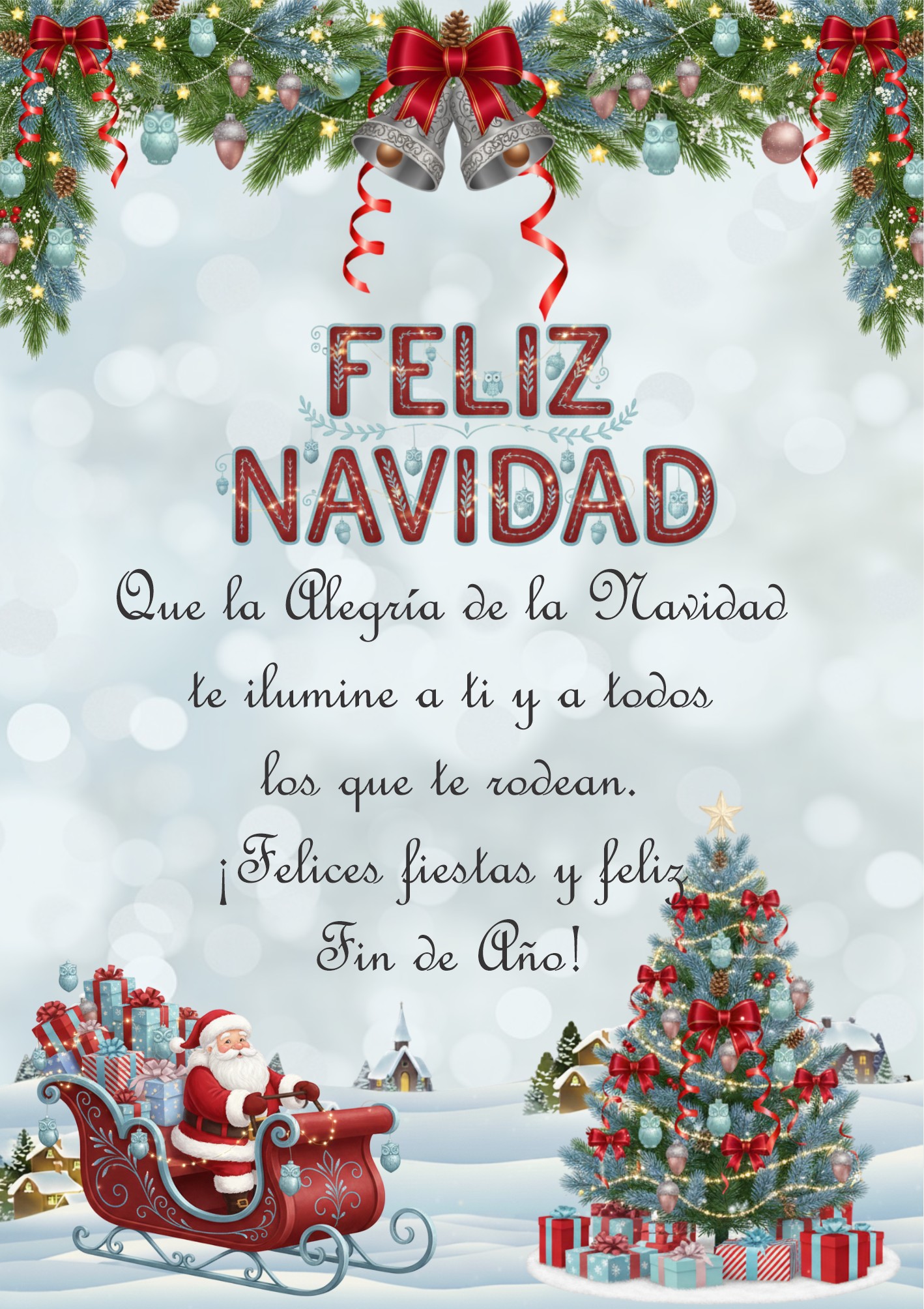 Descargar gratis La tarjeta de Navidad. que presenta un diseño lleno de color y tradición, con ramas de pino, piñas, luces y campanas plateadas que enmarcan el mensaje “Feliz Navidad”. En la parte inferior, muestra a Santa Claus conduciendo su trineo por un paisaje nevado con casas iluminadas y un árbol decorado, transmitiendo una sensación de alegría, paz y espíritu festivo.