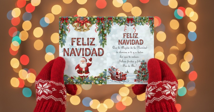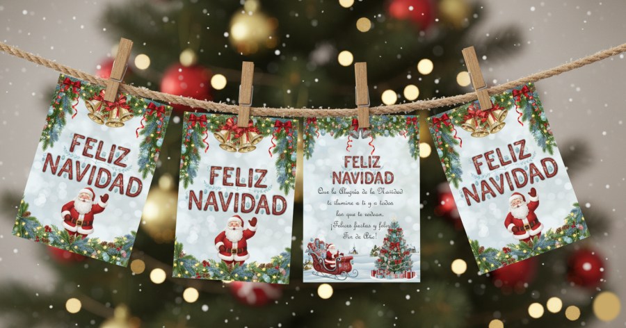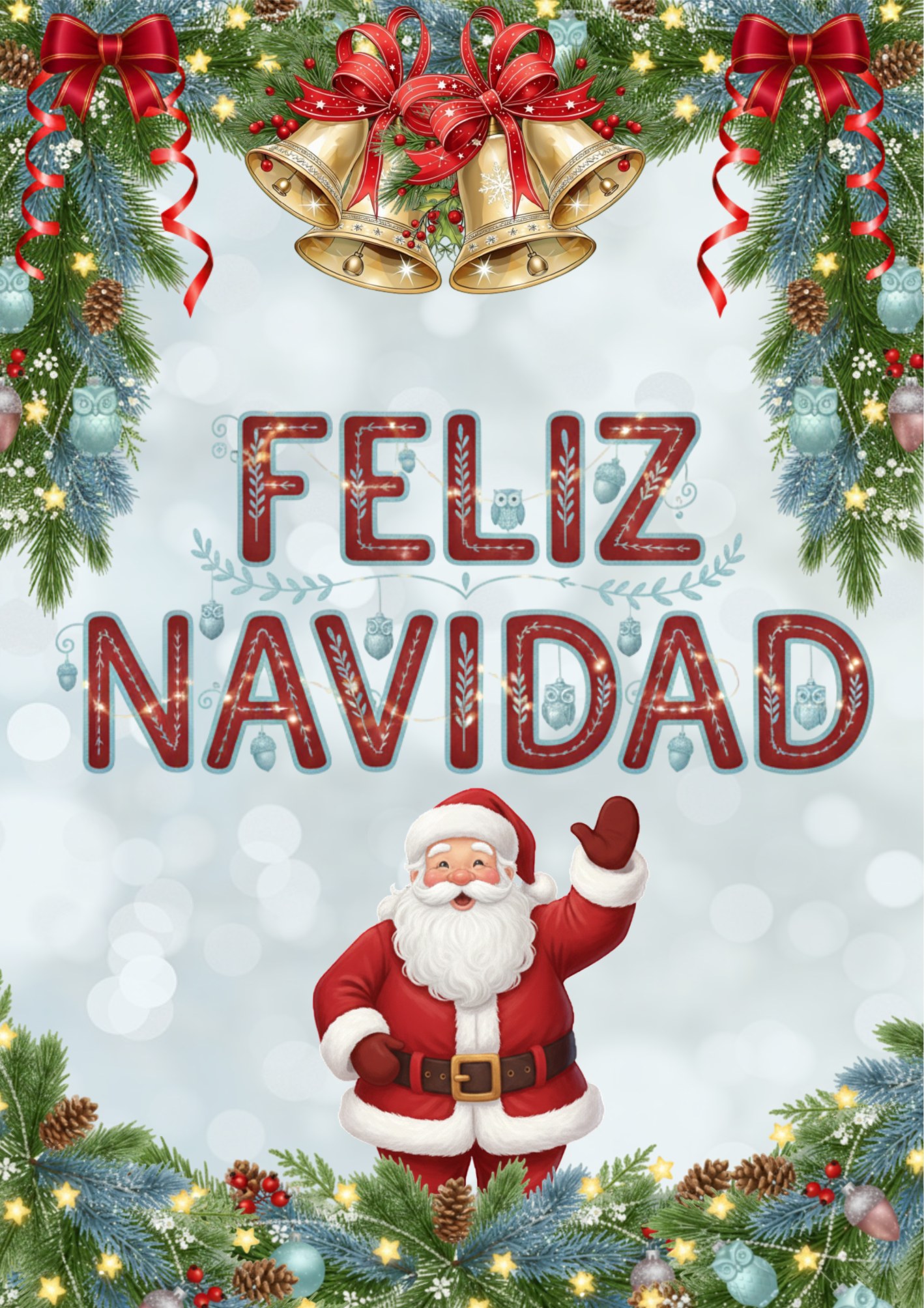 Esta tarjeta de Navidad nos transmite un espíritu cálido y festivo desde el primer vistazo. En la parte superior, podemos observar un hermoso adorno de ramas de pino, piñas, luces y lazos rojos que enmarca la imagen, destacando en el centro dos campanas plateadas decoradas con cintas rojas.