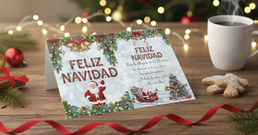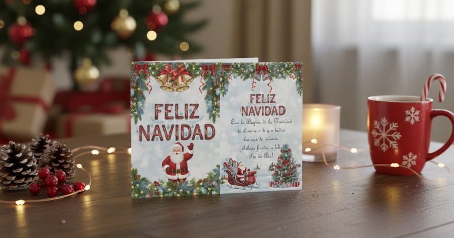 Justamente debajo de las ramas de pino, se encuentra el gran mensaje principal: “Feliz Navidad”, escrito con letras grandes, rojas y adornadas con detalles blancos y hojas invernales, evocando un estilo alegre y elegante.