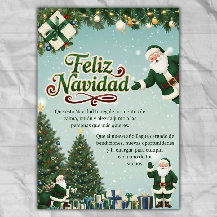El fondo en tonos suaves de blanco y azul con destellos de luz da una sensación de invierno y paz. En conjunto, esta tarjeta combina perfectamente los elementos tradicionales de la Navidad —alegría, luces, regalos y buenos deseos— con un diseño lleno de color y ternura.