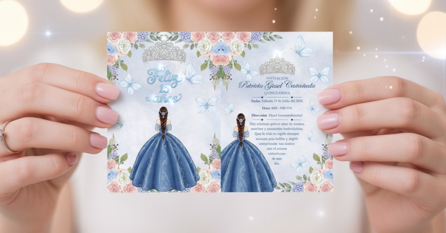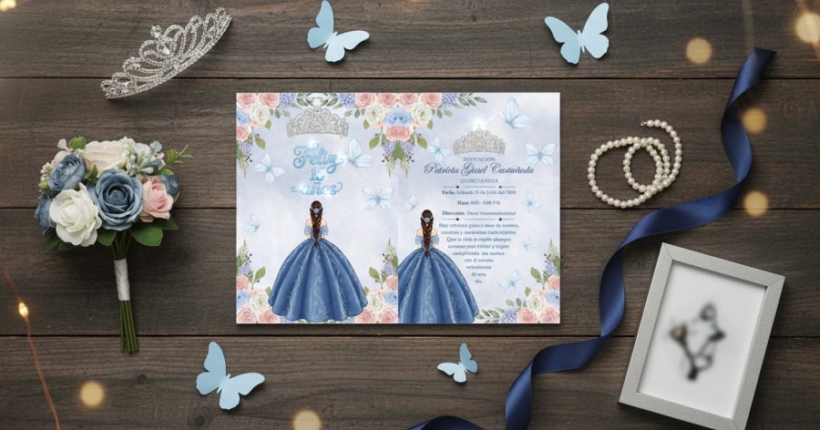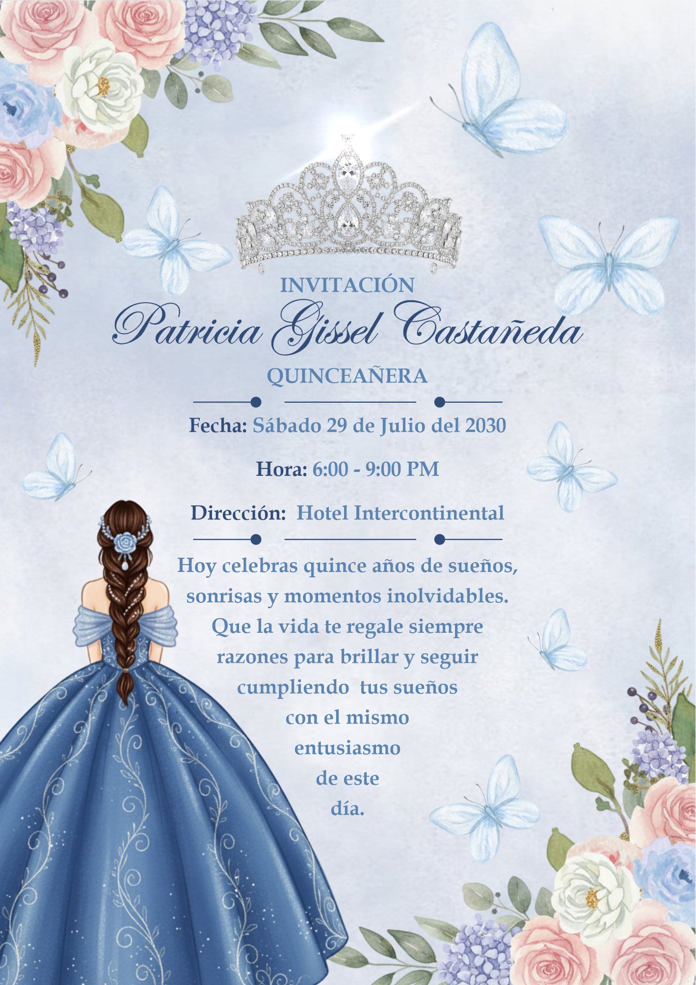 Descarga gratis Esta tarjeta de invitación de 15 años, que presenta un diseño elegante y delicado en tonos azul pastel y lavanda, y que está decorada con mariposas, flores y una corona plateada que simboliza realeza.