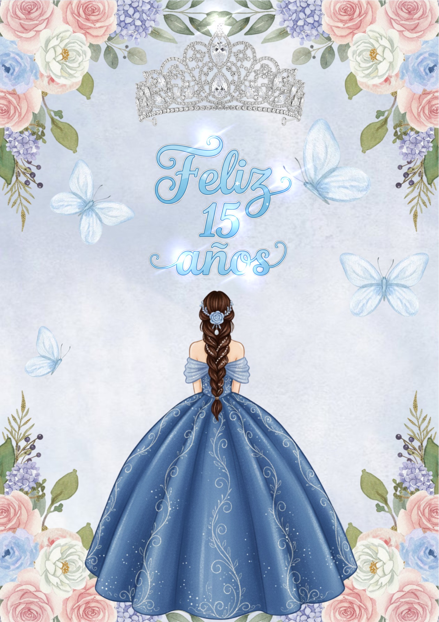 El diseño visual está adornado con flores en tonos rosados, lilas y blancos, acompañadas de mariposas azules que aportan ligereza y un aire mágico. En la parte inferior izquierda aparece la figura de una chica de espaldas con un vestido azul de gala lleno de detalles brillantes, simbolizando a la quinceañera.